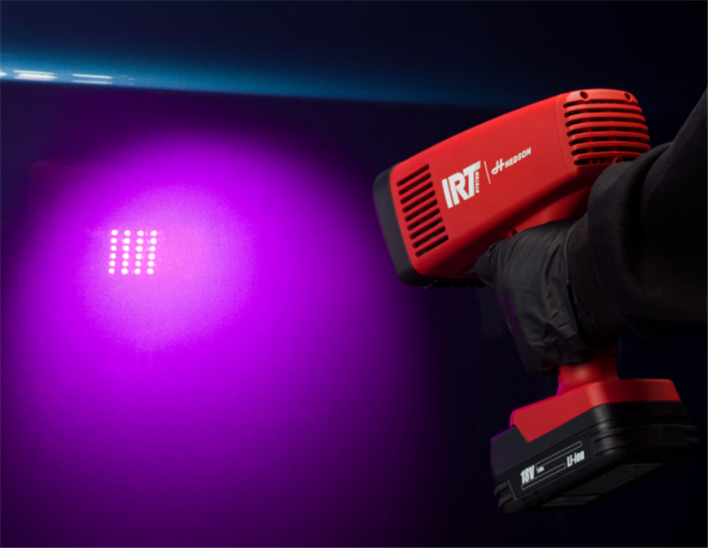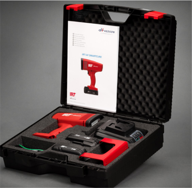 hedson紫外线智能固化干燥机IRT ,配备可更换的高质量长寿命18 V锂离子电池。峰值光性能保持在恒定的高水平,直到显示屏指示电池更换,没有因电池放电而断电的风险。