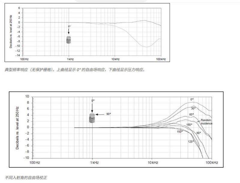 46BF-1 是一款自由场麦克风组,因此针对所有声学应用进行了优化,其中主声源的位置是已知的,并且麦克风可以直接指向它,确保 0° 入射。然而,应该注意的是,1/4 英寸麦克风主体和振膜的小尺寸还可以实现高达 20 kHz 的压力和随机入射(漫射场)测量,而无需移除保护栅格或需要进一步补偿。如果您无法指出声场的性质,这个通用功能非常有用。
